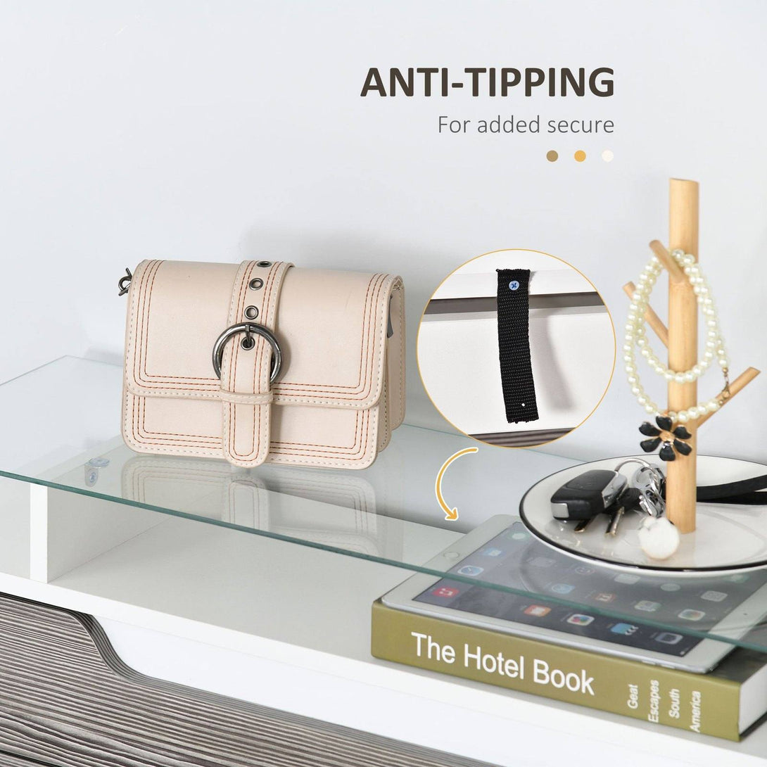 - Features two flip drawers, drawer and top shelf, plenty of storage and display. Glass is easy to clean