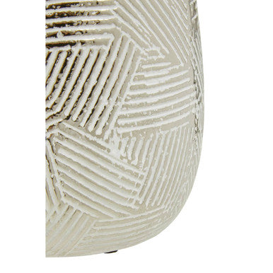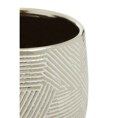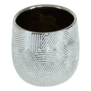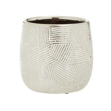 The Honna small planter is ideal for home office arrangement and decor. This ceramic planter is intricately handcrafted and features a crosshatch pattern in the silver metallic finish on the white tactile surface.