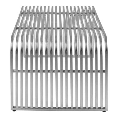 Formed into a rectangular shape, this coffee table features a brushed stainless steel construction finished in a reflective silver coloured coating. The linear detailing gives it a symmetrical, aesthetically pleasing look and lends it a distinctive edge.