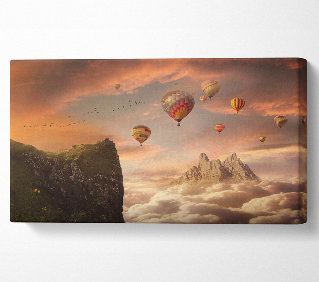 Hot Air Balloon Valley wide canvas, printed on coated polyester canvas. Mounted on to a 44mm box frame, ready to hang.