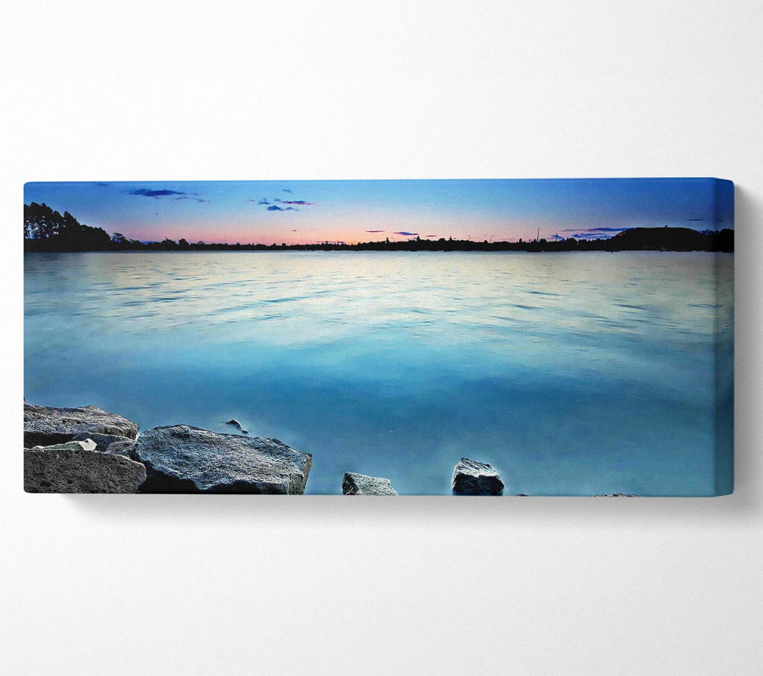 Ice Blue Ocean Rocks canvas, printed on coated polyester canvas. Mounted on to a 44mm box frame, ready to hang.