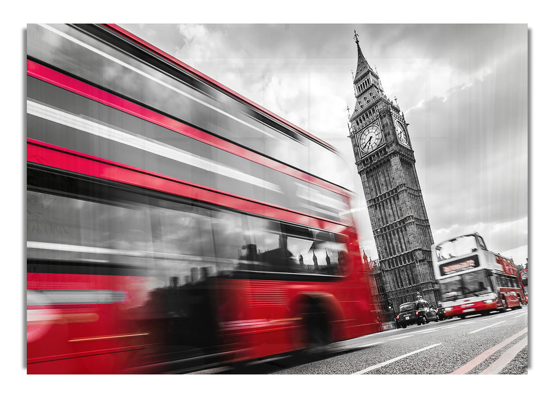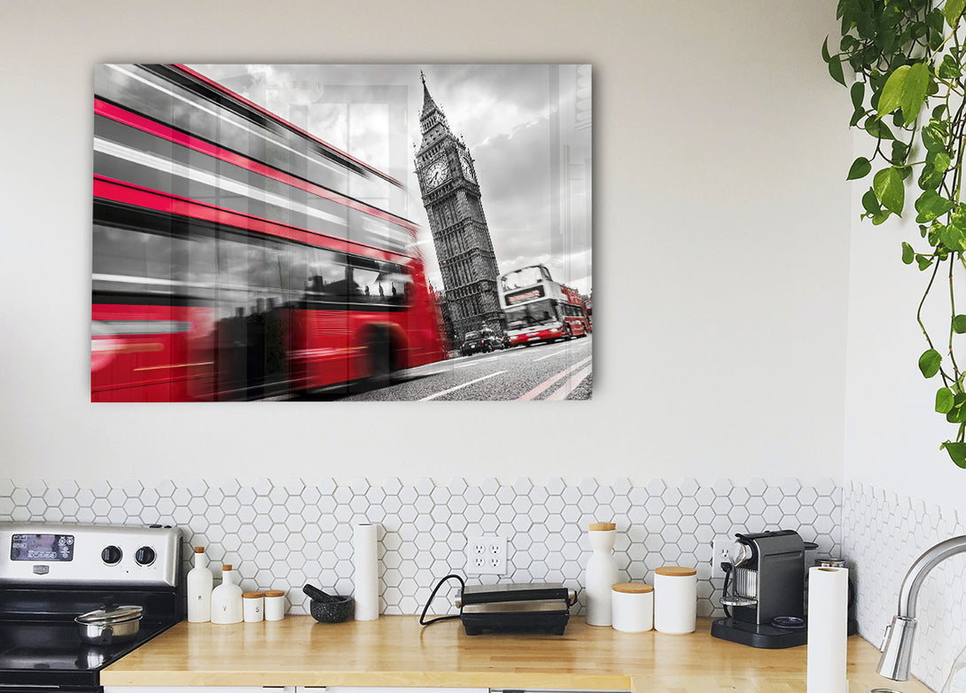 Iconic Red Bus Passed Big Ben acrylic print, UV printed onto 5mm thick acrylic glass. Comes with everything you need to hang on your wall.