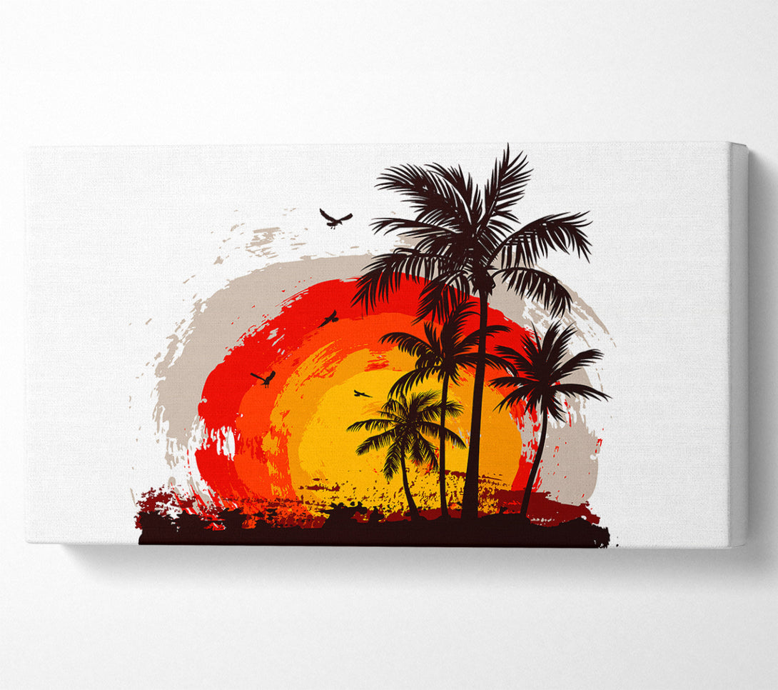 Impressionist Palm Tree Sun wide canvas, printed on coated polyester canvas. Mounted on to a 44mm box frame, ready to hang.