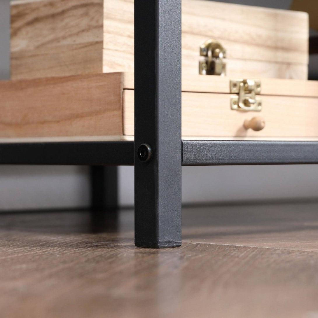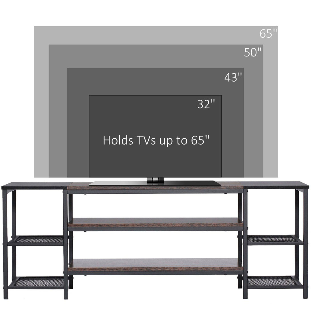 Upgrade your living room with this HOMCOM TV unit. It has six shelves and a large table-top: room for holding a TV and all the watching essentials you need. The open shelves of the TV stand are suitable for fitting plenty of differently-sized appliances. The black metal frame means a strong structure, whilst the wood-effect shelves create a striking look for industrial style. A must-have companion for every relaxing moment.