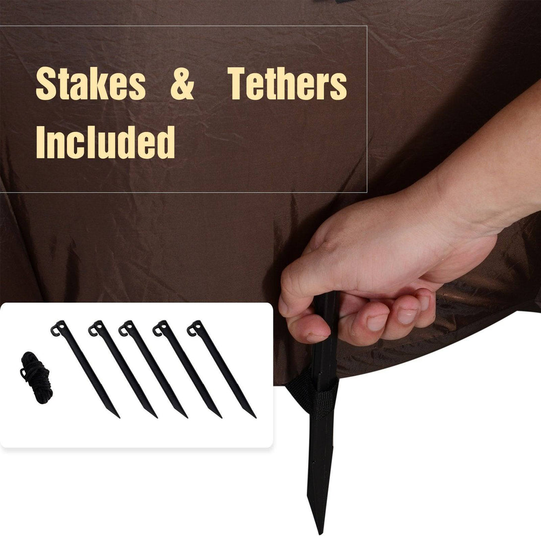 • Internal fan, two tether ropes, four ground stakes and sandbag included