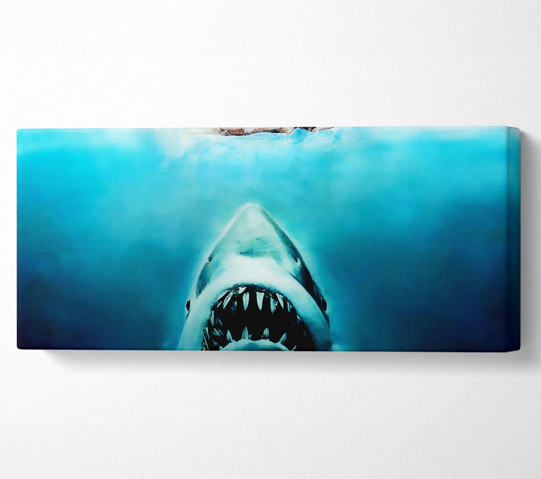 Jaws canvas, printed on coated polyester canvas. Mounted on to a 44mm box frame, ready to hang.