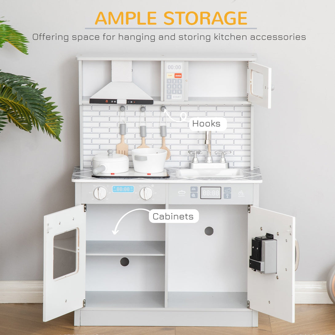 • Includes detachable sink, simulation faucet, microwave, range hood, 5 pcs wooden kitchen accessories and more