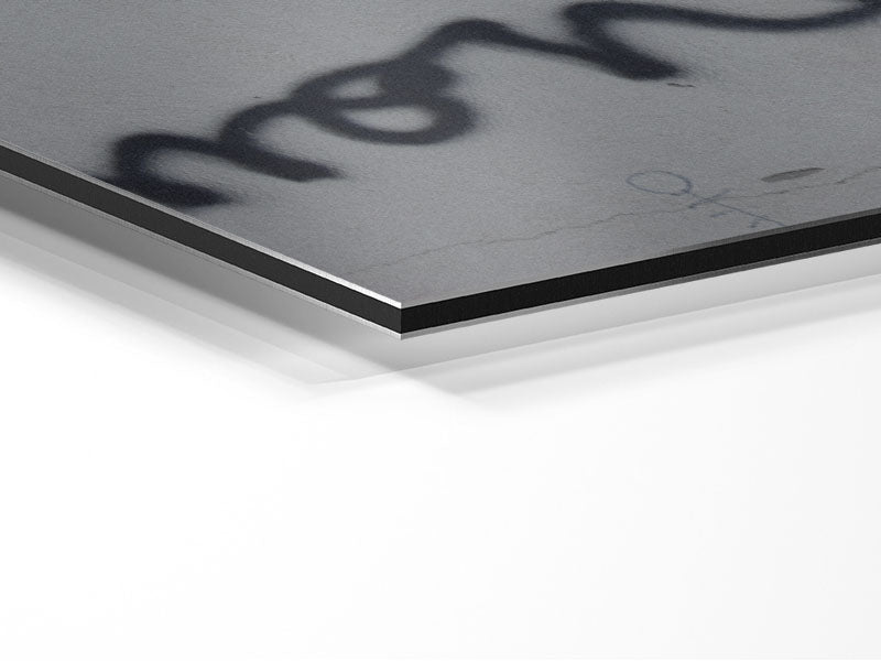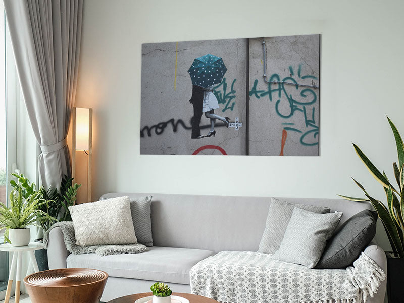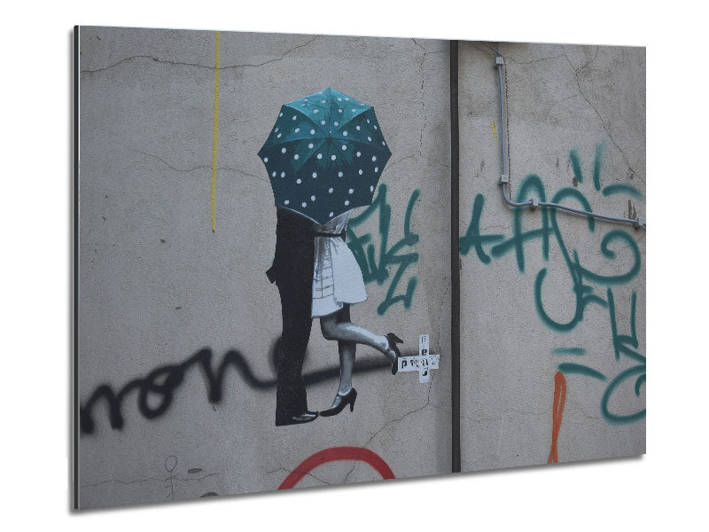 Kissing under the umbrella graffiti Printed on brushed aluminium dibond. A modern way to display art and easy to maintain.