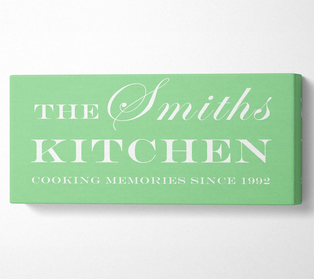 Kitchen Quote Your Family Name And Date Kitchen Green canvas, printed on coated polyester canvas. Mounted on to a 44mm box frame, ready to hang.