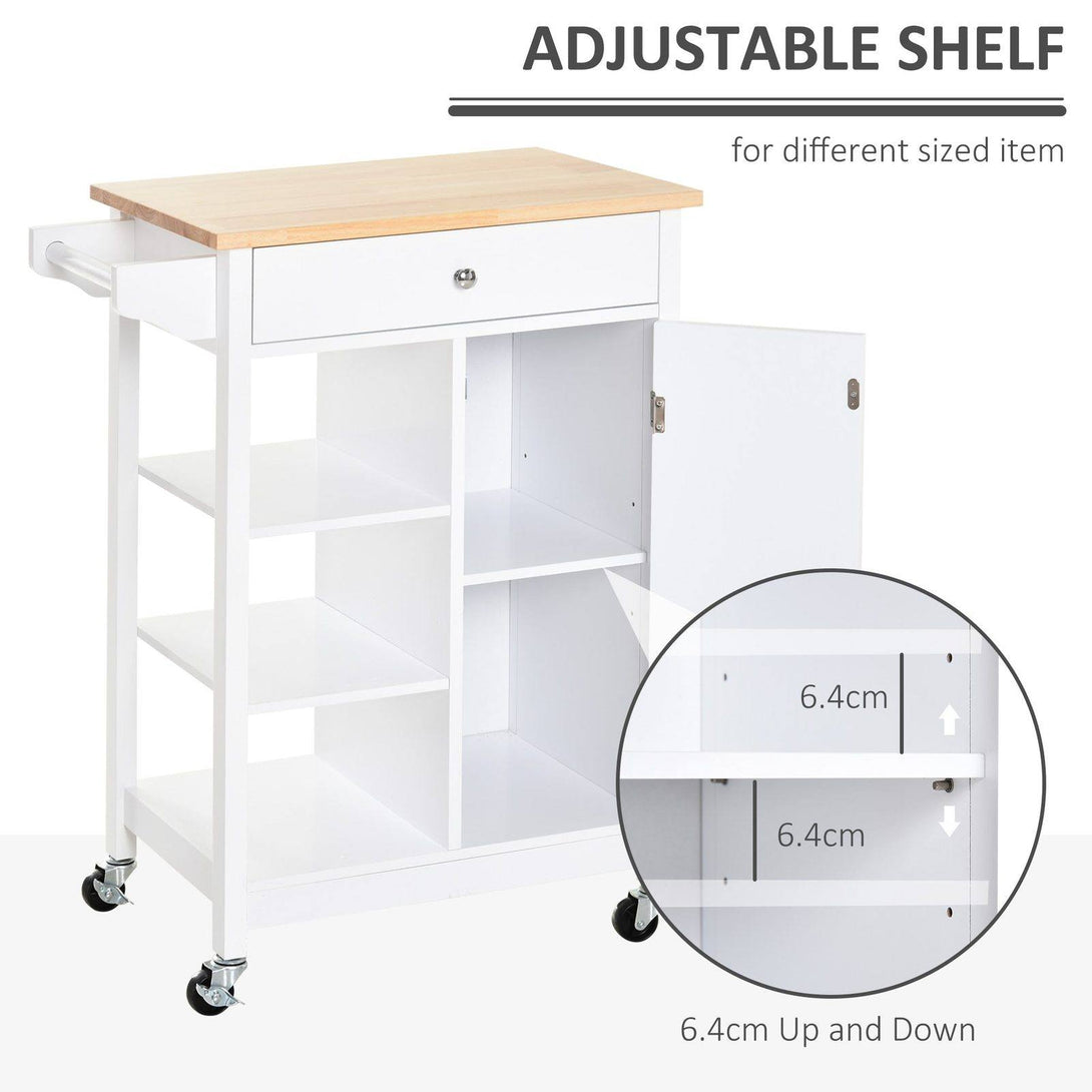 Organise your kitchen with this stylish rolling cart from HOMCOM. The frame, made from MDF, is durable and reliable for everyday use, and is made into a design which features three open side shelves, a cupboard, a top drawer and a side hanging rail. A wooden tabletop provides extra preparation room. A compact and functional piece which is a must-have companion in your home.
