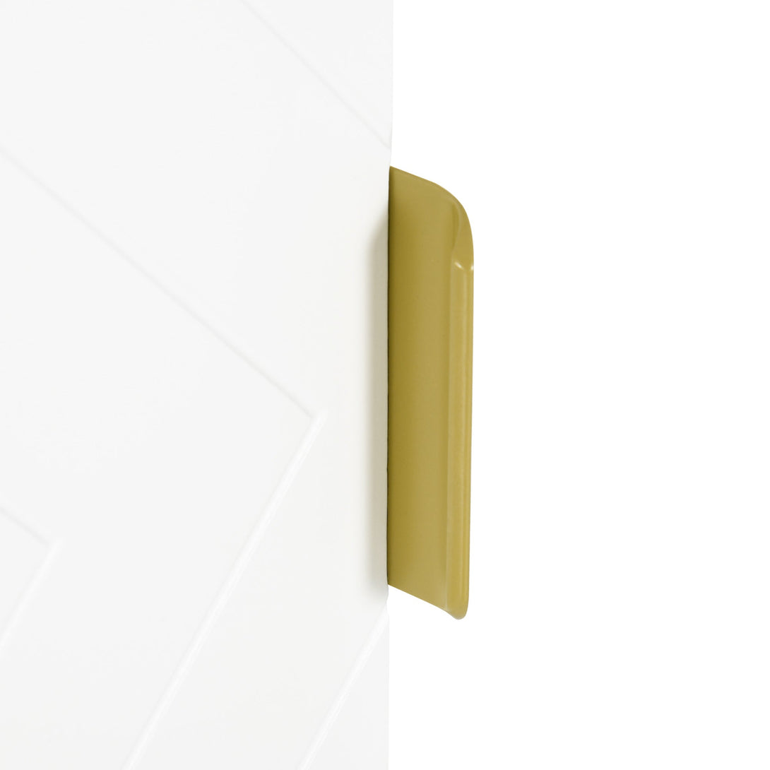 - Simple white design, with embossed doors and gold-colour accents