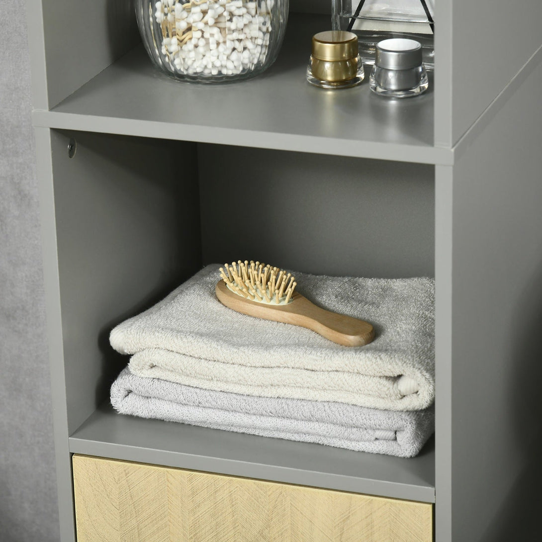 A clean-cut cabinet for a clean bathroom space: this HOMCOM tallboy. A mid-grey frame, it comes with wood-effect doors for a simple Farmhouse style design. It features a top and bottom cupboard, with two middle shelves - plenty of open and closed storage. The shelves inside both cupboards can be moved and set to three different levels: create a storage space size of your choice. Freestanding bathroom cabinet package comes with anti-tipping straps for safety.