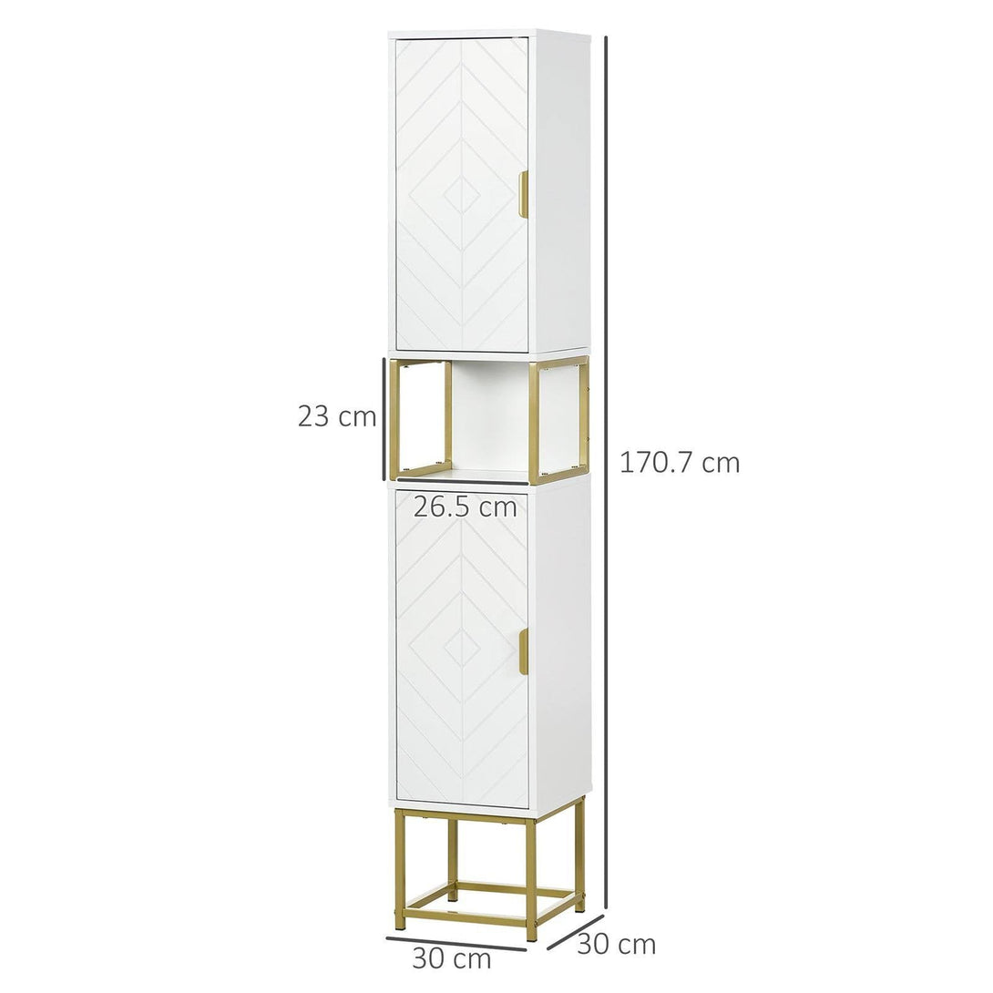 Store bathroom essentials in style: do it with this kleankin slim bathroom cabinet. Comes with two large cupboards and middle shelf. The tall, slim design is great for smaller rooms. Clean white structure, with embossed doors for gentle character; finished with a gold-coloured accents.