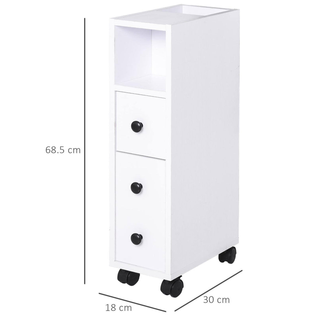 Expand your storage space beautifully with this bathroom cabinet from kleankin. A design which focuses on efficiency and style for homes which require such, it is made with a large bathroom cabinet, a top drawer and two open compartments, giving you a decent amount of storage room. The frame is made from sturdy particle board to ensure it's suitable for everyday use, and its slimline sizing will fit into narrow spots quite easily. White all over for a fresh appeal, it's equipped with black handles for a smart contrasting look and is finished with wheels for easy movement.