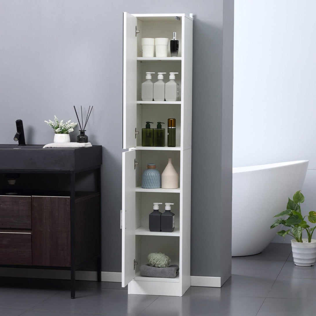 A beautiful and tidy bathroom starts with this slimline cabinet from kleankin. Inside, there are five shelves which offer plenty of storage - separate sections give each family/flat member their own individual space. Two-cupboard design comes with two doors: top is fitted with a mirror so you can get ready, with push-open operation to open/close easily; bottom is fitted with handle. Made from particle board, it's durable and suitable for everyday use, finished with safe anti-tipping straps.