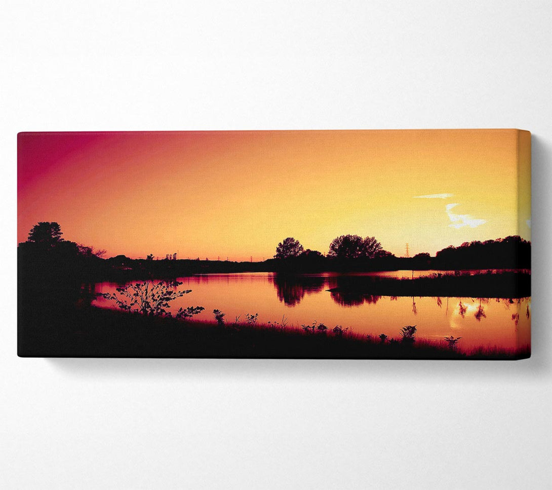 Lake At Sunset canvas, printed on coated polyester canvas. Mounted on to a 44mm box frame, ready to hang.