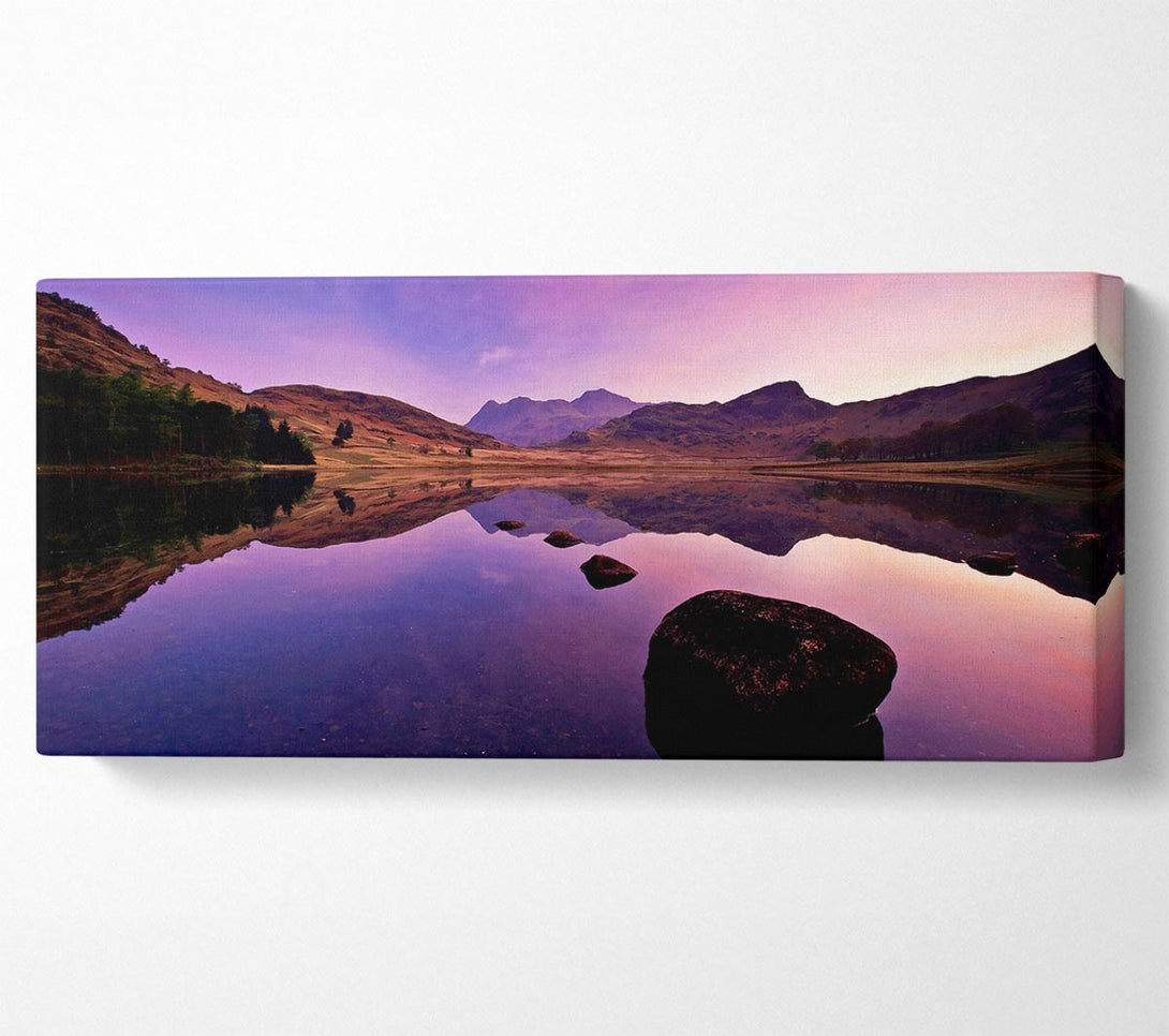 Lake Mountain Reflections canvas, printed on coated polyester canvas. Mounted on to a 44mm box frame, ready to hang.