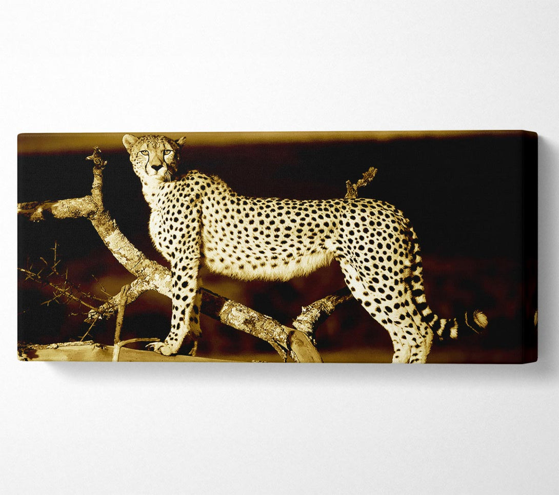 Leopard Perch Sepia canvas, printed on coated polyester canvas. Mounted on to a 44mm box frame, ready to hang.