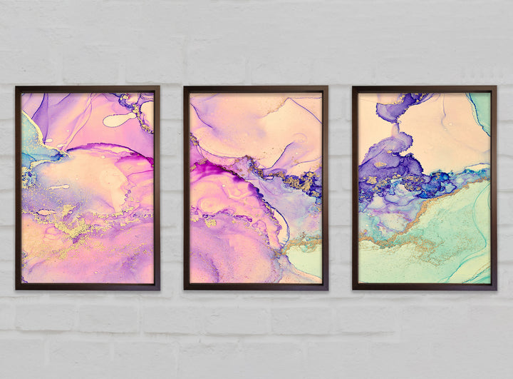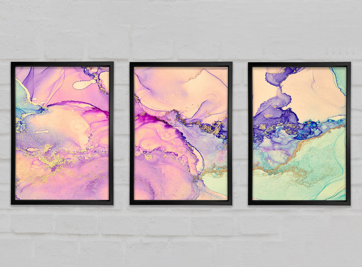 Lilac Pastel Ink Water set of 3 framed print wall art, available in mutiple frame colours. Ready to hang from the box and handmade in the United Kingdom.