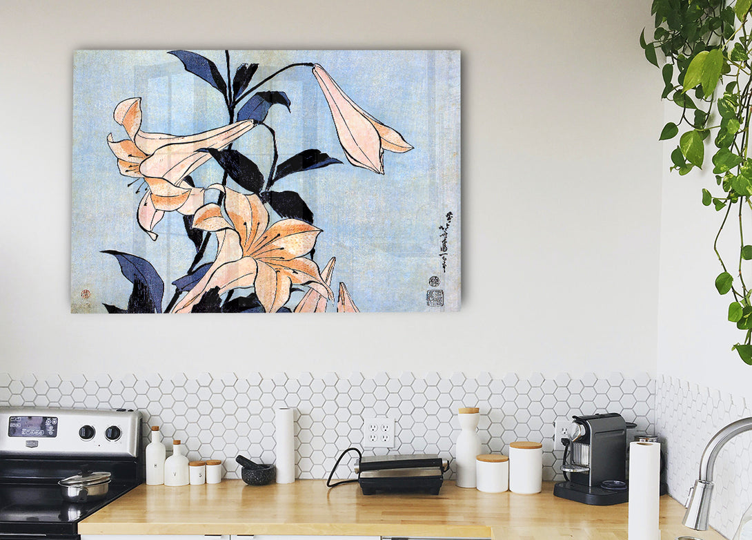 Lilies By Hokusai acrylic print, UV printed onto 5mm thick acrylic glass. Comes with everything you need to hang on your wall.