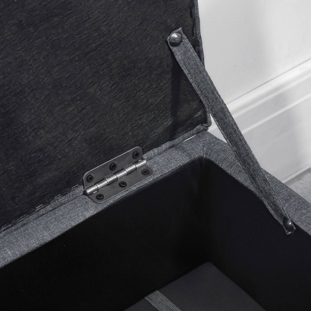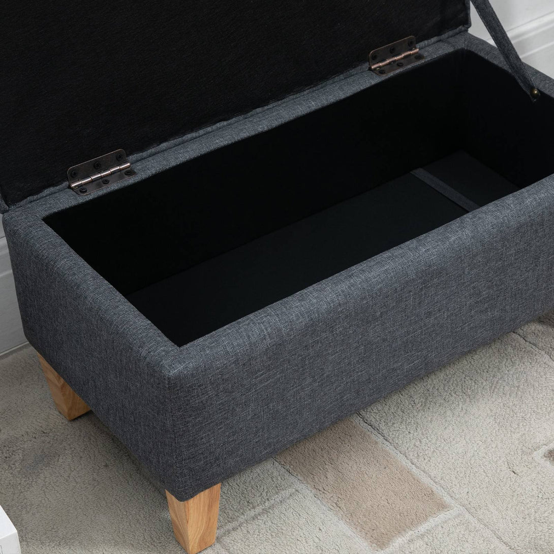 - Lid top is padded so you can sit on it comfortably. Linen-look upholstery is smooth