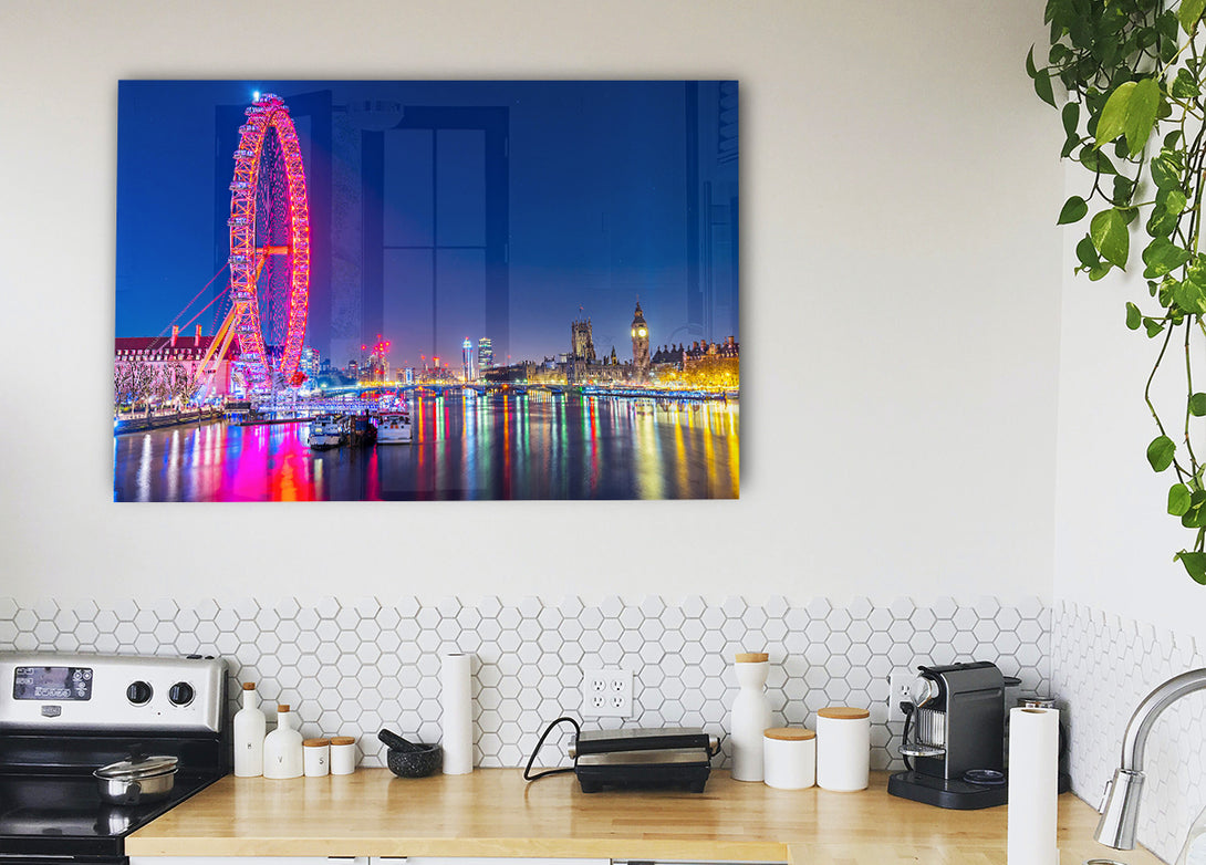 London Eye Rainbow Thames At Night acrylic print, UV printed onto 5mm thick acrylic glass. Comes with everything you need to hang on your wall.