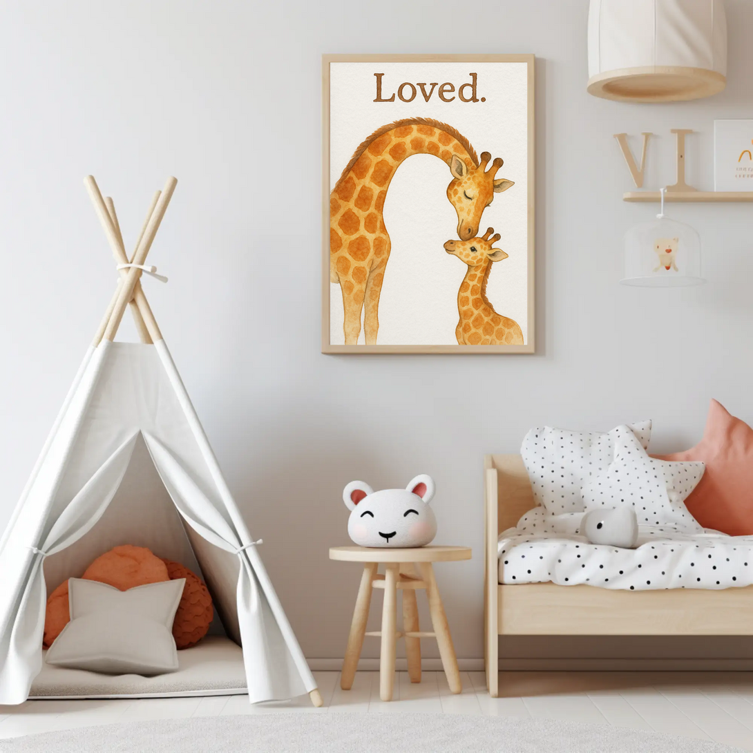 Loved Giraffe Family Watercolour Nursery Children's Room Wall Decor Print