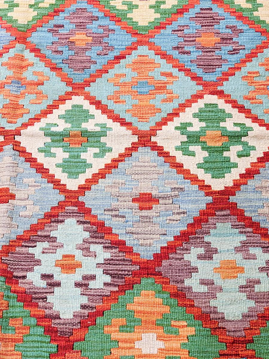 Bursting with vibrant hues and playful geometric patterns, this Afghan Kilim Rug is a celebration of craftsmanship, culture, and colour. Handwoven with 100% wool and naturally dyed, this beauty isn’t just a feast for the eyes—it’s also durable, lightweight, and fully reversible. Whether you’re jazzing up a neutral space or doubling down on bold aesthetics, this kilim has your back(and your floor!).
