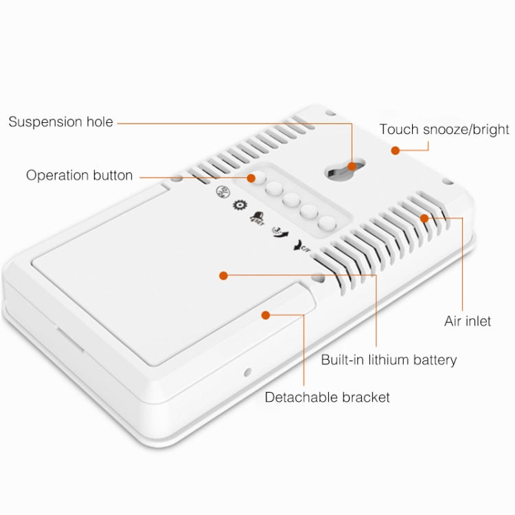 4. Function description: temperature display, humidity display, comfort reminder, historical maximum and minimum temperature humidity record within 24 hours, alarm clock function, time function, date display, touch top backlight, automatic light sensing, USB charging (internal lithium battery)