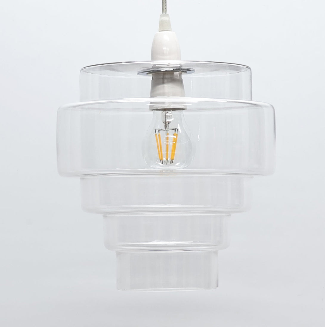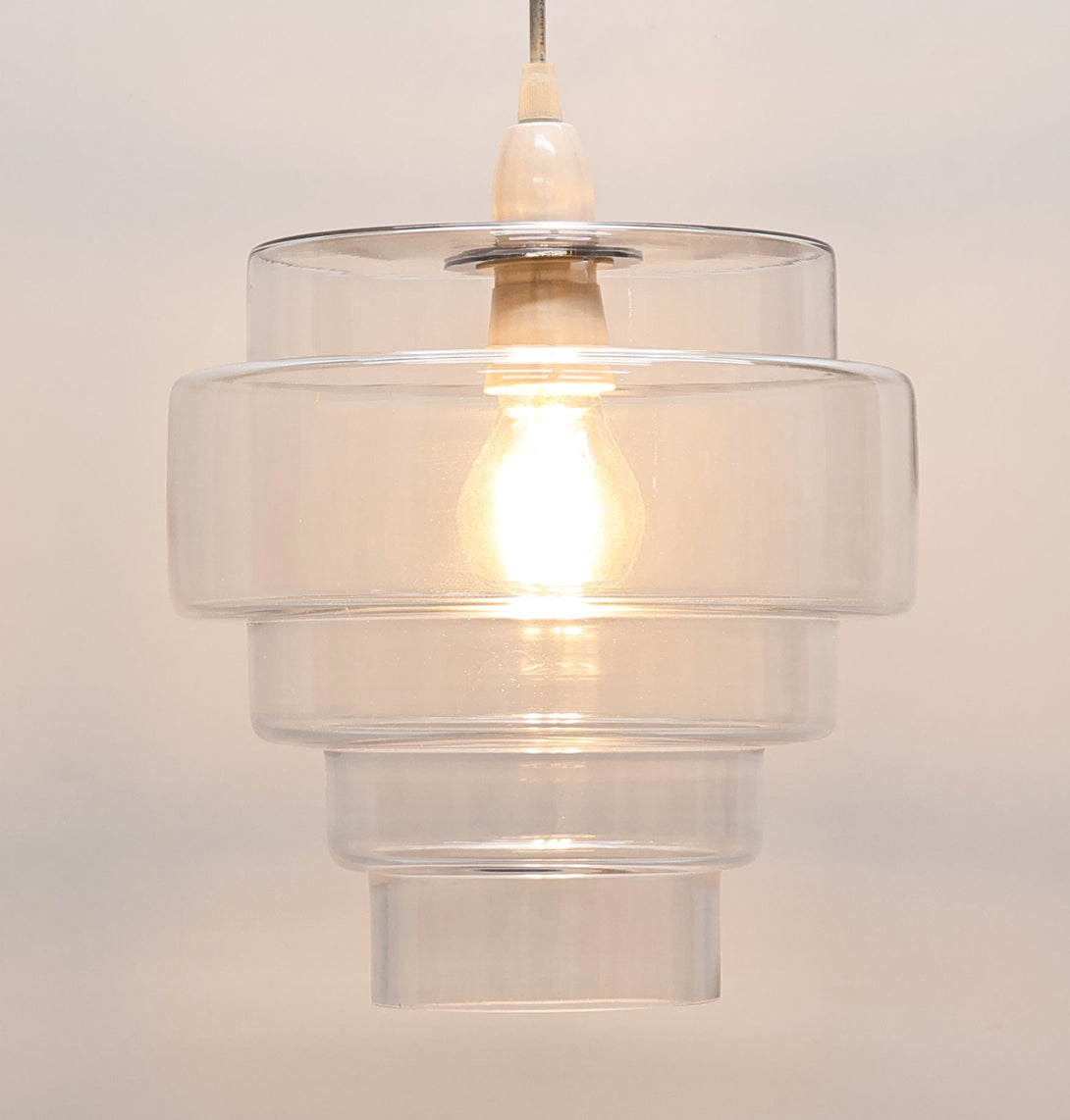 Showcasing a striking 5-tier layered shade crafted from clear glass, the Mira pendant brings depth, elegance, and a touch of vintage glamour to any room. Its reflective finish pairs beautifully with decorative bulbs, creating a warm, ambient glow.