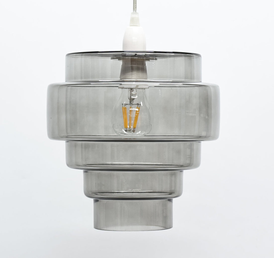 Showcasing a striking 5-tier layered shade crafted from smoked glass, the Mira pendant brings depth, elegance, and a touch of vintage glamour to any room. Its reflective finish pairs beautifully with decorative bulbs, creating a warm, ambient glow.