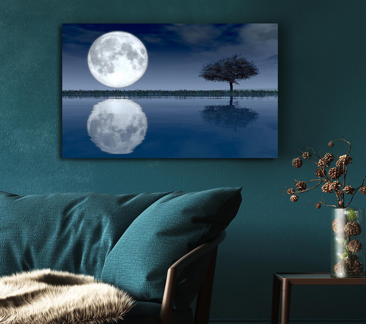 Transform your space with the Moon Reflection Canvas Print, a stunning piece of wall art that captures the serene beauty of a moonlit night. This high-quality print features a crystal-clear reflection of the moon on a tranquil lake, bringing a sense of calm and wonder to any room. Available in five sizes, from small to oversized, this versatile canvas fits any wall space perfectly. The durable, fade-resistant inks ensure long-lasting vibrancy, while the premium canvas material adds a touch of elegance. Ideal for living rooms, bedrooms, or offices, this captivating artwork is easy to hang and instantly enhances your decor. Enjoy the peaceful charm of the moon every day with this exquisite canvas print.