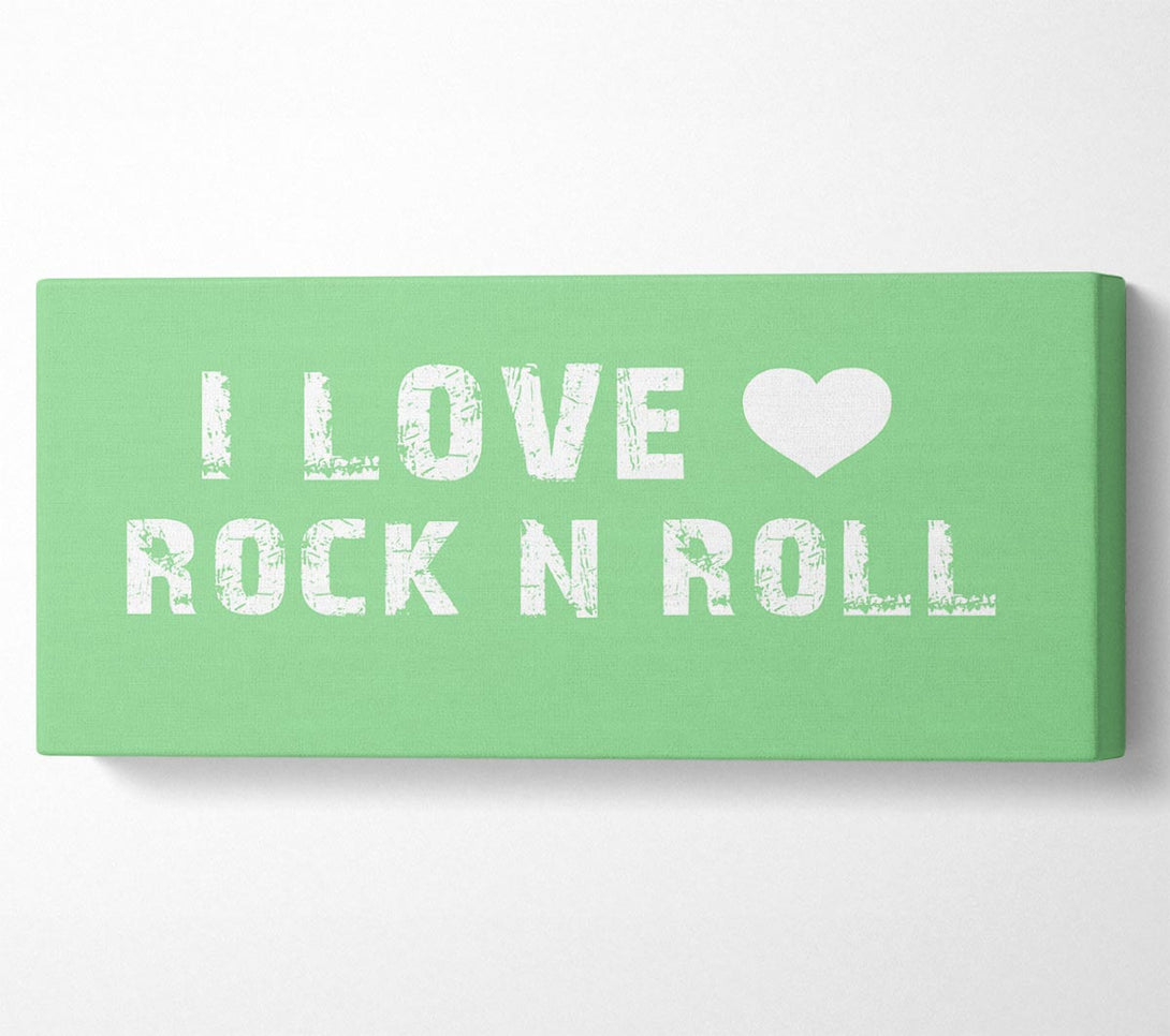 Music Quote I Love Rock N Roll Green canvas, printed on coated polyester canvas. Mounted on to a 44mm box frame, ready to hang.