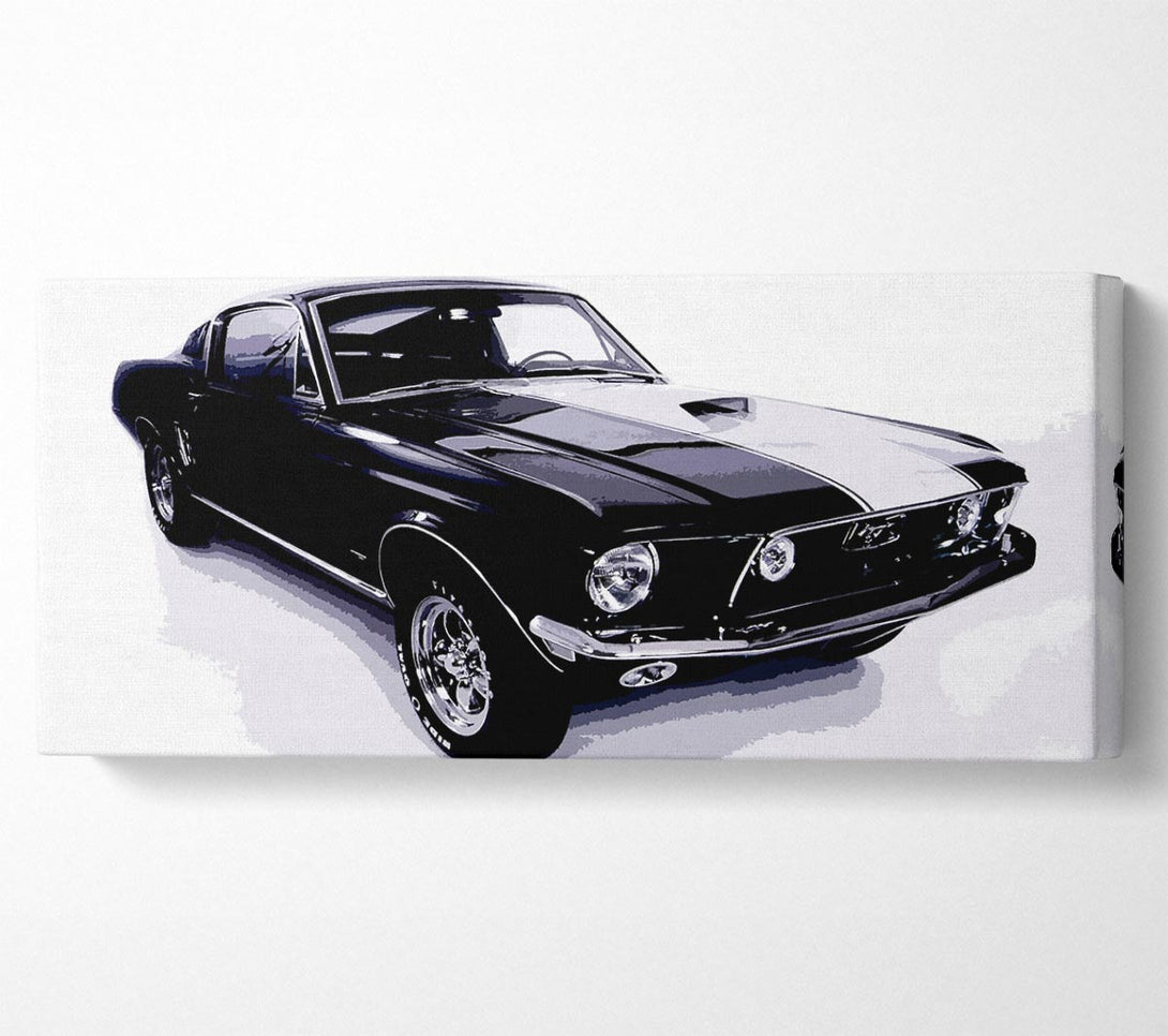 Mustang 67 B n W canvas, printed on coated polyester canvas. Mounted on to a 44mm box frame, ready to hang.