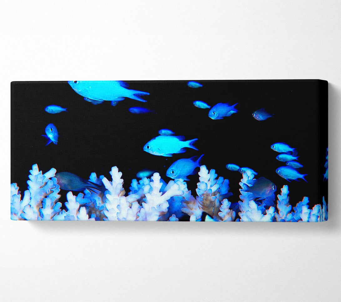 Neon Fish canvas, printed on coated polyester canvas. Mounted on to a 44mm box frame, ready to hang.