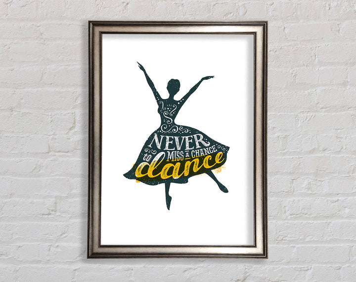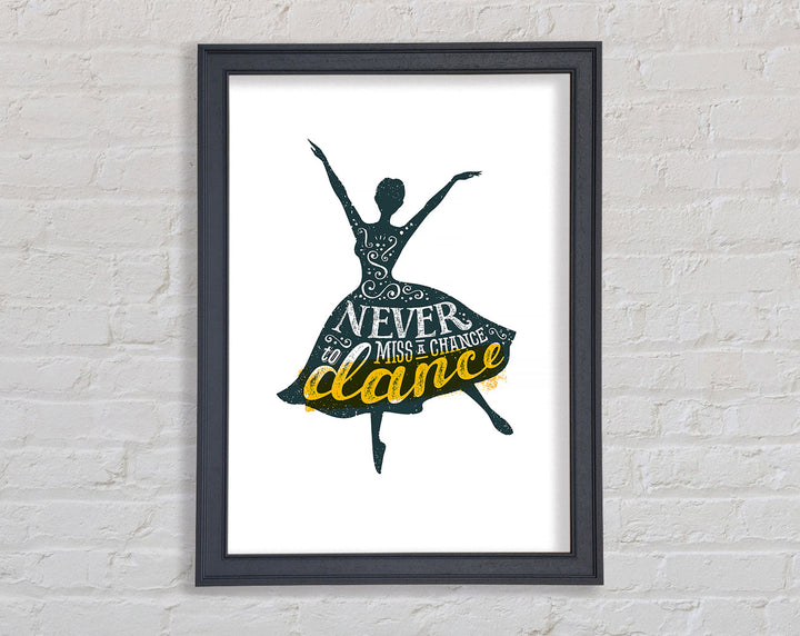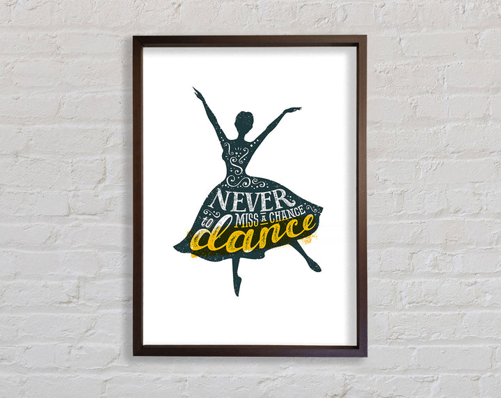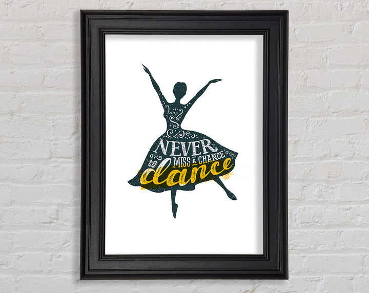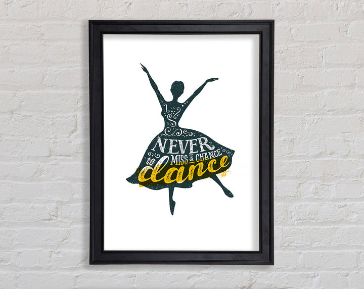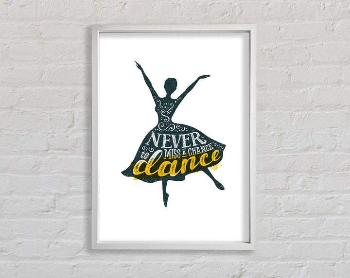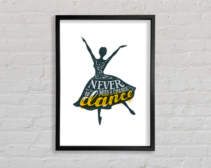 Introducing the "Never Miss A Chance To Dance 1" framed print, a perfect addition to any space that celebrates the joy of movement. This stunning piece of framed art is available in six sizes, ranging from small to oversized, ensuring a fit for every room. Choose from a variety of vibrant colors to match your décor. Each print is carefully handmade in the United Kingdom, highlighting the exceptional craftsmanship. Ready to hang, this framed print makes decorating your home effortless. Whether as a gift or a personal treat, this art piece brings inspiration and charm to your walls, reminding you to always embrace the dance of life.