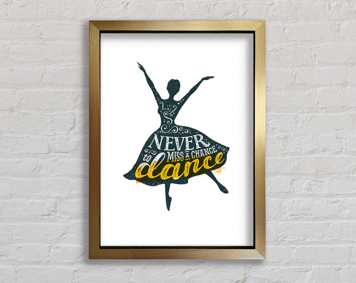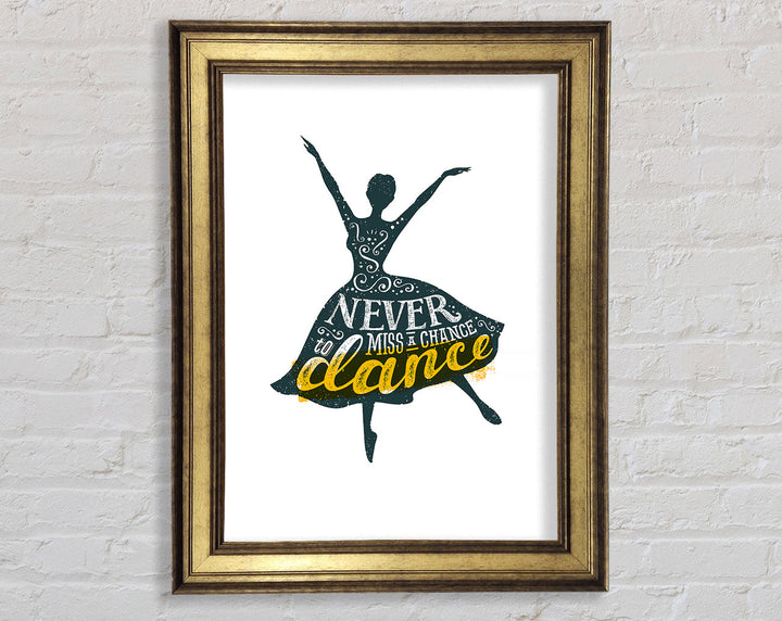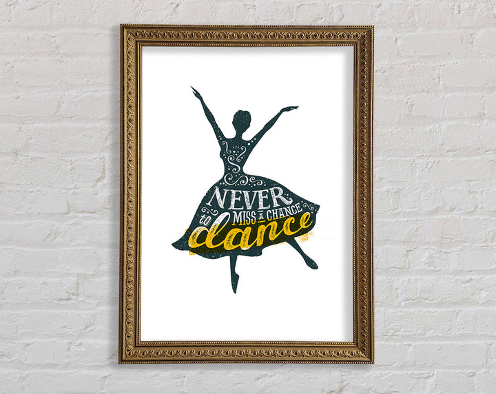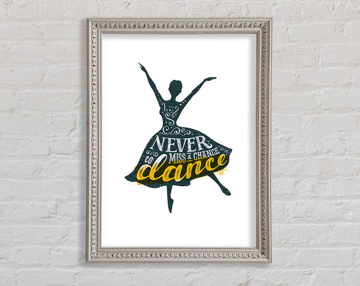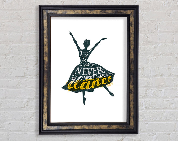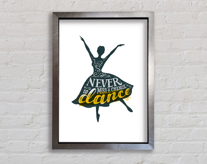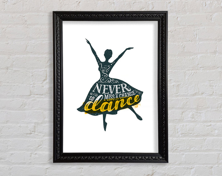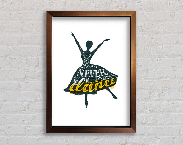 Introducing the "Never Miss A Chance To Dance 1" framed print, a perfect addition to any space that celebrates the joy of movement. This stunning piece of framed art is available in six sizes, ranging from small to oversized, ensuring a fit for every room. Choose from a variety of vibrant colors to match your décor. Each print is carefully handmade in the United Kingdom, highlighting the exceptional craftsmanship. Ready to hang, this framed print makes decorating your home effortless. Whether as a gift or a personal treat, this art piece brings inspiration and charm to your walls, reminding you to always embrace the dance of life.