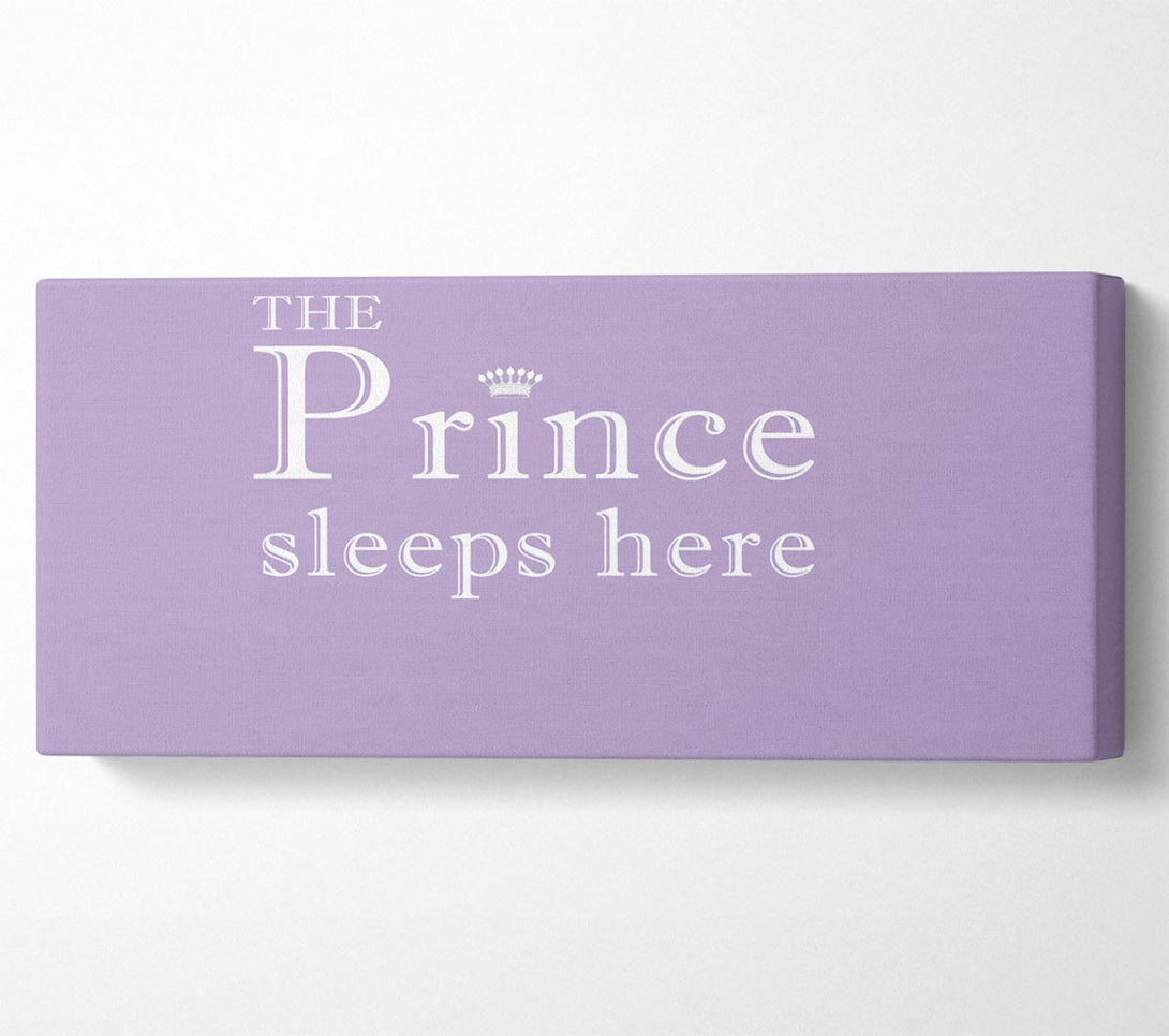 Nursery Quote The Prince Sleeps Here Lilac canvas, printed on coated polyester canvas. Mounted on to a 44mm box frame, ready to hang.