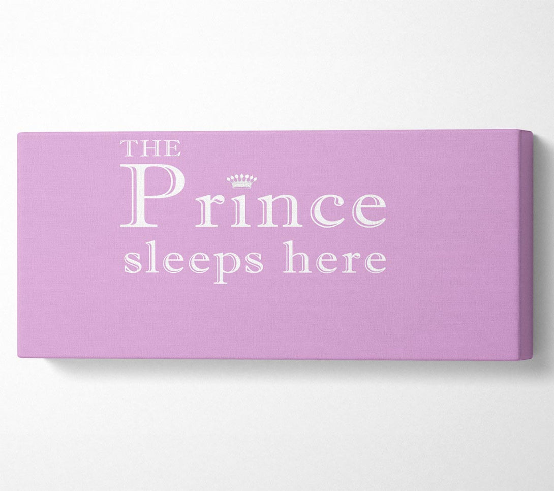 Nursery Quote The Prince Sleeps Here Pink canvas, printed on coated polyester canvas. Mounted on to a 44mm box frame, ready to hang.