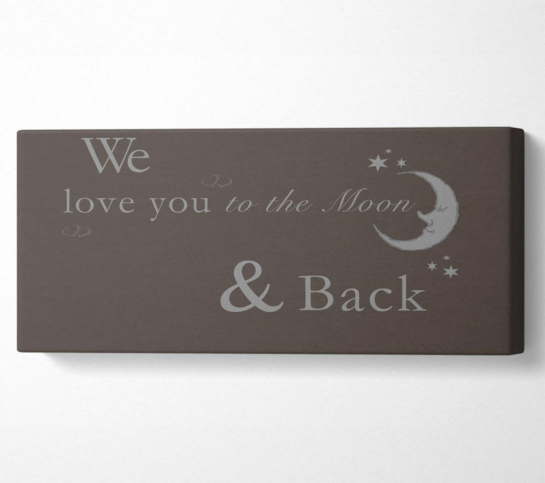 Nursery Quote We Love You To The Moon And Back 2 Chocolate canvas, printed on coated polyester canvas. Mounted on to a 44mm box frame, ready to hang.