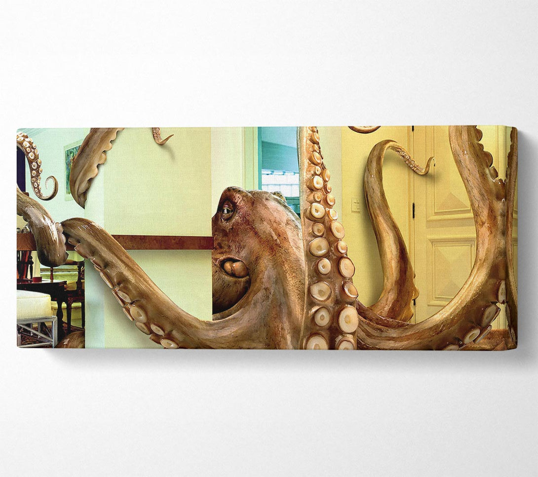 Octopus Invasion canvas, printed on coated polyester canvas. Mounted on to a 44mm box frame, ready to hang.