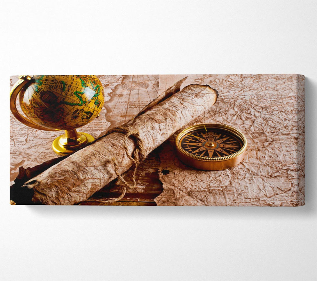 Old Maps And Compass With Globe canvas, printed on coated polyester canvas. Mounted on to a 44mm box frame, ready to hang.