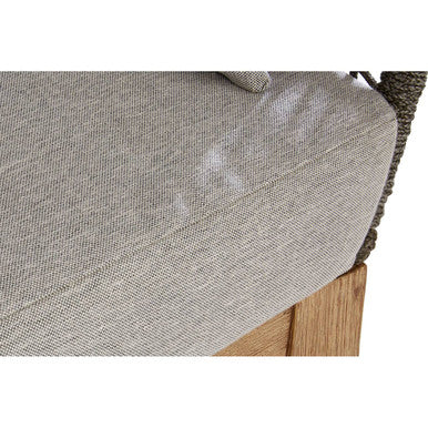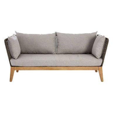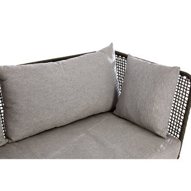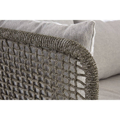 Intricately woven from grey rope, this sofa features flared back and arms. The raised sides in decorative texture match the padded seat and cushions. Angular wooden legs contribute to mid-century modern aesthetics.
