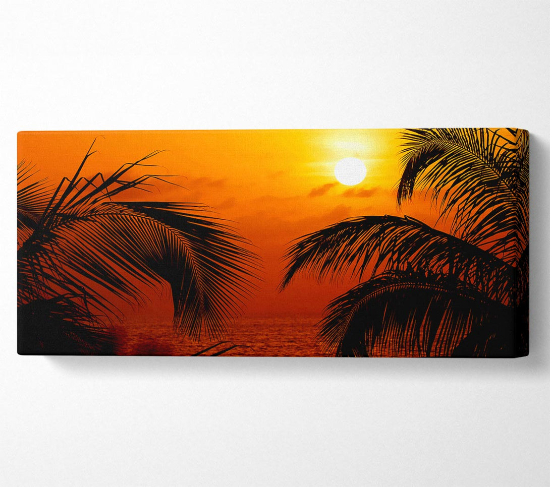 Orange Palmtree Sun canvas, printed on coated polyester canvas. Mounted on to a 44mm box frame, ready to hang.