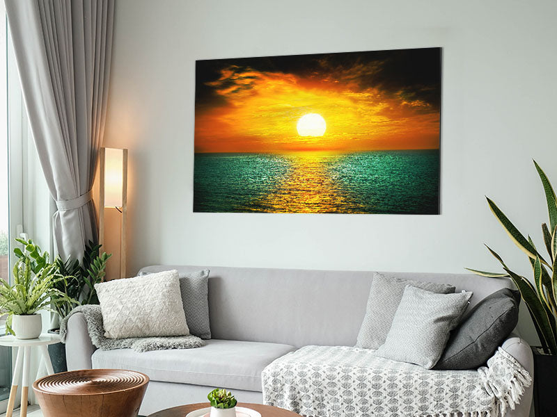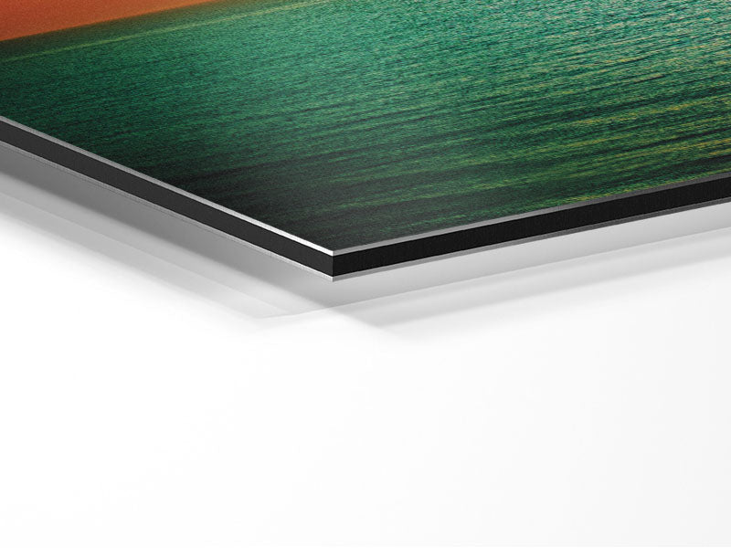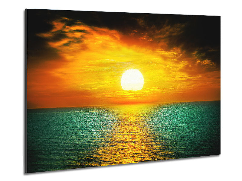 Orange Sun Reflections On The Green Ocean Printed on brushed aluminium dibond. A modern way to display art and easy to maintain.