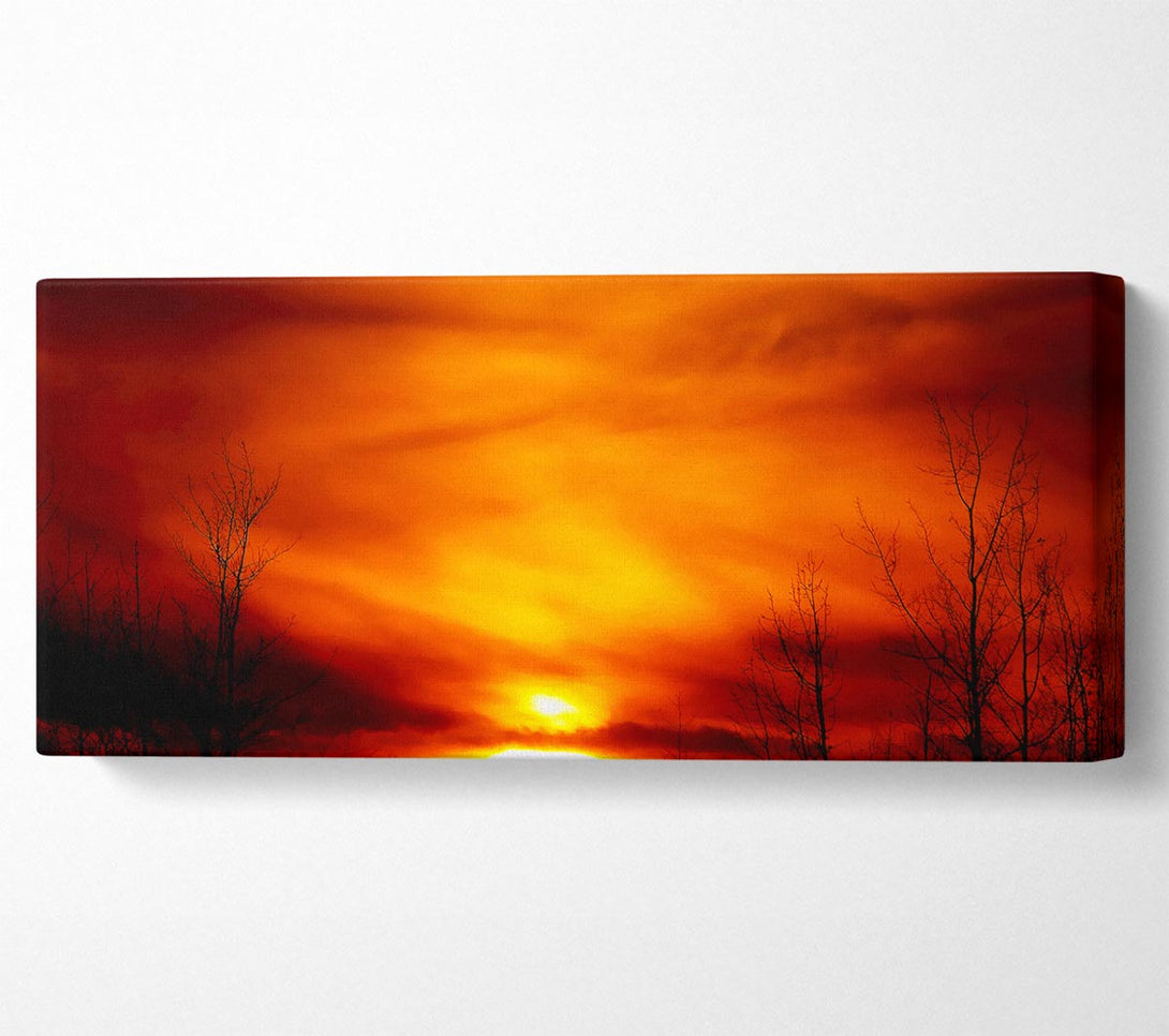 Orange Sunblaze Through The Misty Sky canvas, printed on coated polyester canvas. Mounted on to a 44mm box frame, ready to hang.