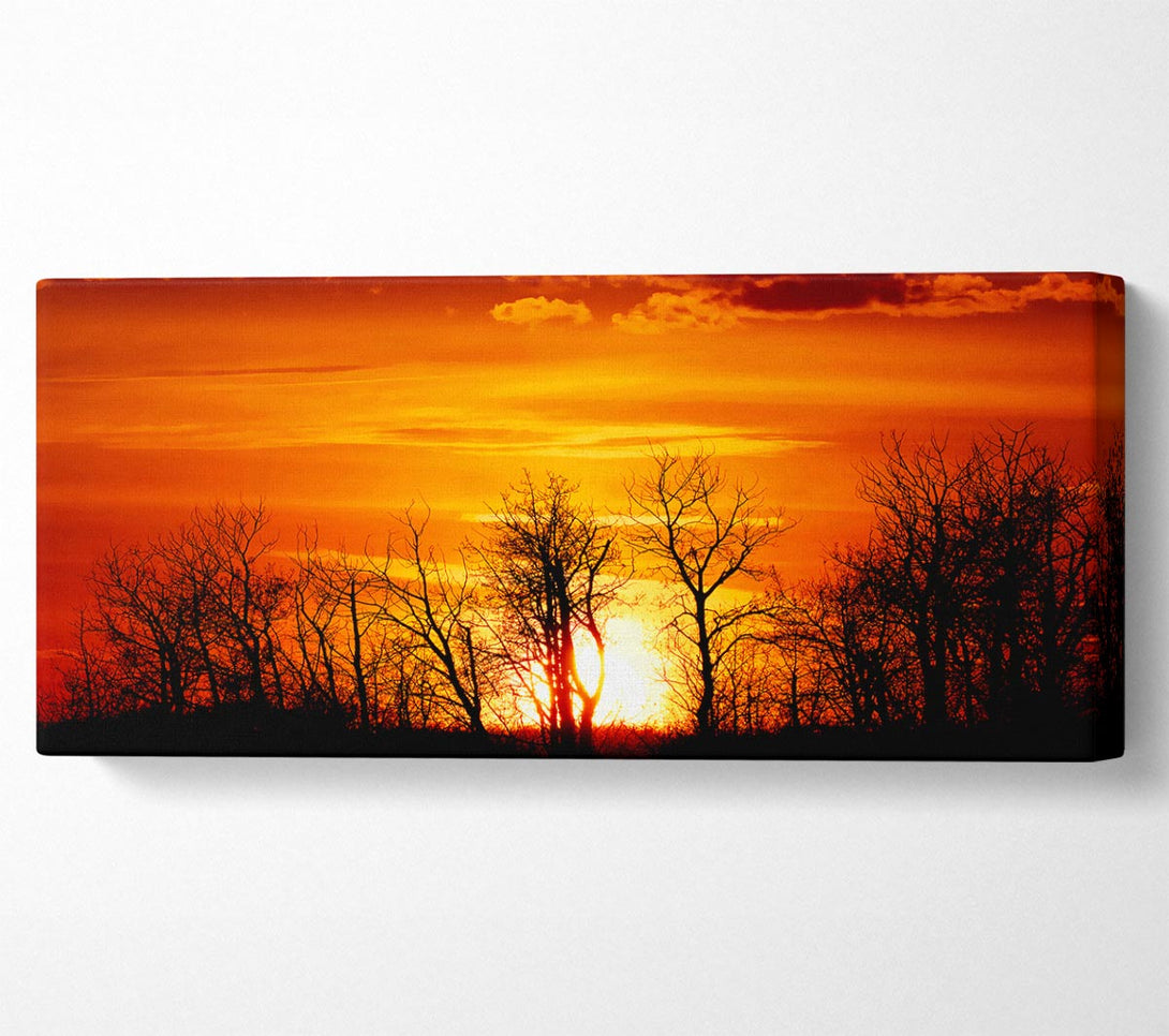 Orange Sunset Treeline canvas, printed on coated polyester canvas. Mounted on to a 44mm box frame, ready to hang.