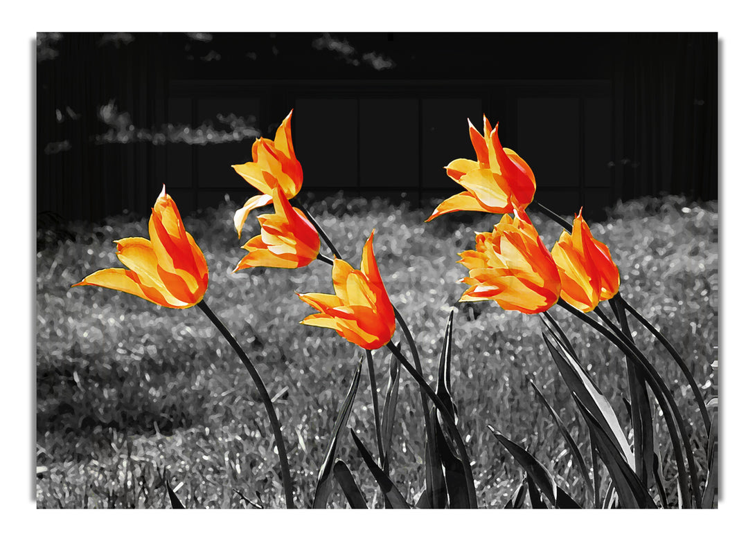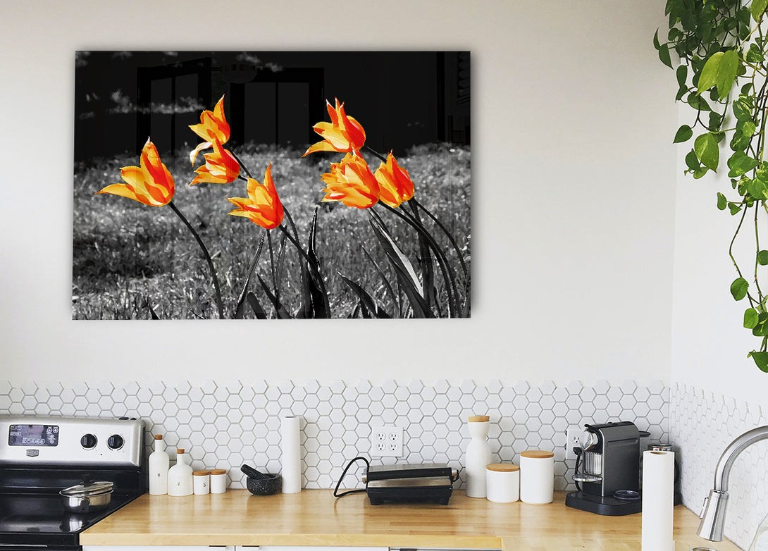 Orange Tulips On B~w acrylic print, UV printed onto 5mm thick acrylic glass. Comes with everything you need to hang on your wall.