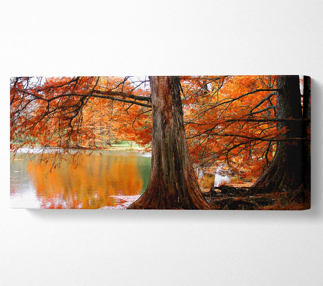 Orange Winter Lake Reflections canvas, printed on coated polyester canvas. Mounted on to a 44mm box frame, ready to hang.