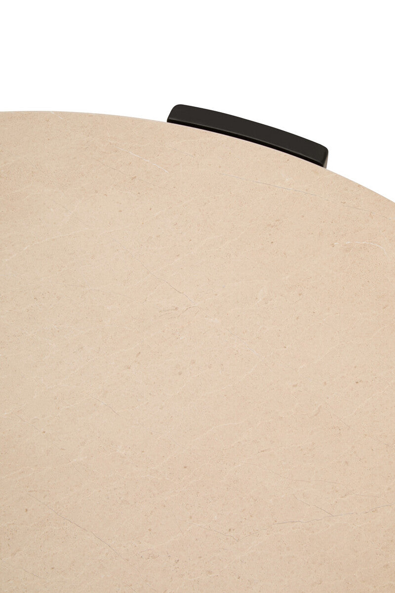 A beautifully honed cream marble tabletop brings warmth and light to your room, showcasing naturally occurring veining and color variation. The darker structural details (in a sleek black finish) frame the stone and create a contemporary two-tone look that coordinates effortlessly with neutral palettes, black hardware, or mixed metals.